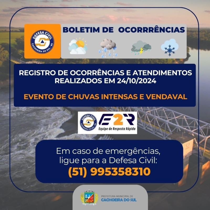 Em decorrência do evento de chuvas intensas com vendaval, sendo registrados 25mm nas últimas 08 horas, foram necessárias ações conjuntas das Equipes de Resposta da Prefeitura Municipal, Corpo de Bombeiros e RGE SUL.